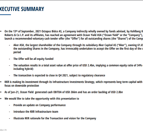 Ocean Yield was bought out by leading American private equity firm Kohlberg Kravis Roberts (KKR) for $2.4 billion in September 2021. FMG was tasked with providing the update on the company’s financial performance, introduce the KKR Infrastructure team, and illustrate KKR’s rationale for the transaction and vision for the company.